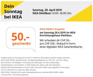 Am Sonntag, 28. April 2019, gibts bei IKEA Dietlikon CHF 50 pro CHF 250 Einkaufswert geschenkt. Somit erhält man CHF 100 geschenkt bei einem Einkauf von CHF 500 usw, beliebig kumulierbar.