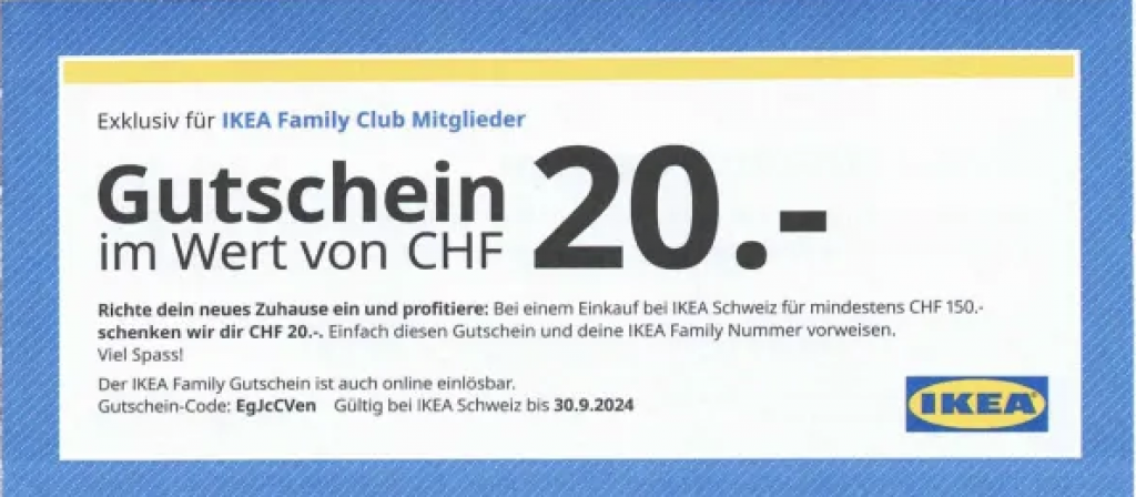 Als IKEA Family Club Mitglied erhält man bei einem Einkauf für mindestens 150.- Franken einen Rabatt von 20.- Franken.