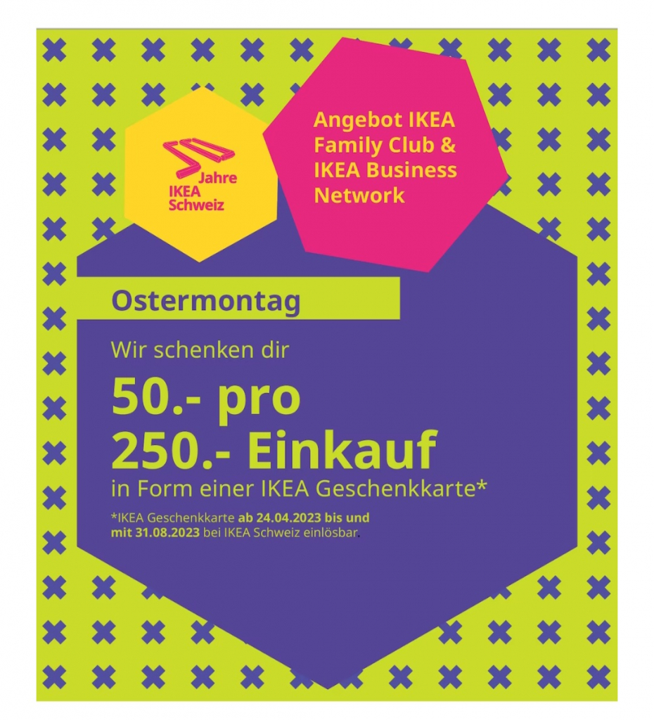 Angebot gültig im IKEA Einrichtungshaus Lyssach gegen Nachweis deiner Schweizer IKEA Family oder IKEA Business Network Nummer. Mindesteinkaufsbetrag von CHF 250.- gilt nach Abzug aller Aktionen, Rabatte und Serviceleistungen. Nicht gültig im Schwedischen Restaurant, Bistro und Schwedenshop sowie auf IKEA.ch, bei Bestellungen per Telefon oder E-Mail, sowie bei Zahlungen von Serviceleistungen und dem Kauf von Geschenkkarten. Keine Barauszahlung. Gültig nur auf verfügbare Artikel.Gültig nur auf verfügbare ArtikelIKEA Geschenkkarte ab 24.04.2023 bis und mit 31.08.2023 bei IKEA Schweiz einlösbar.