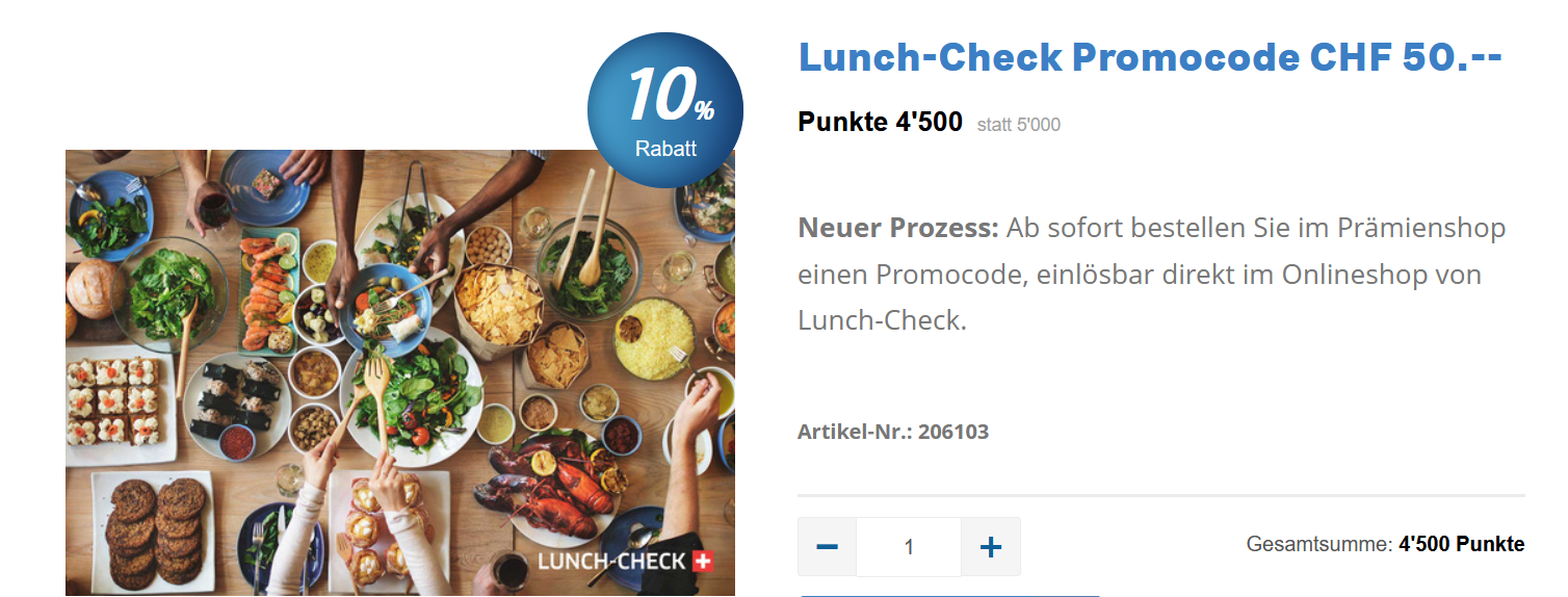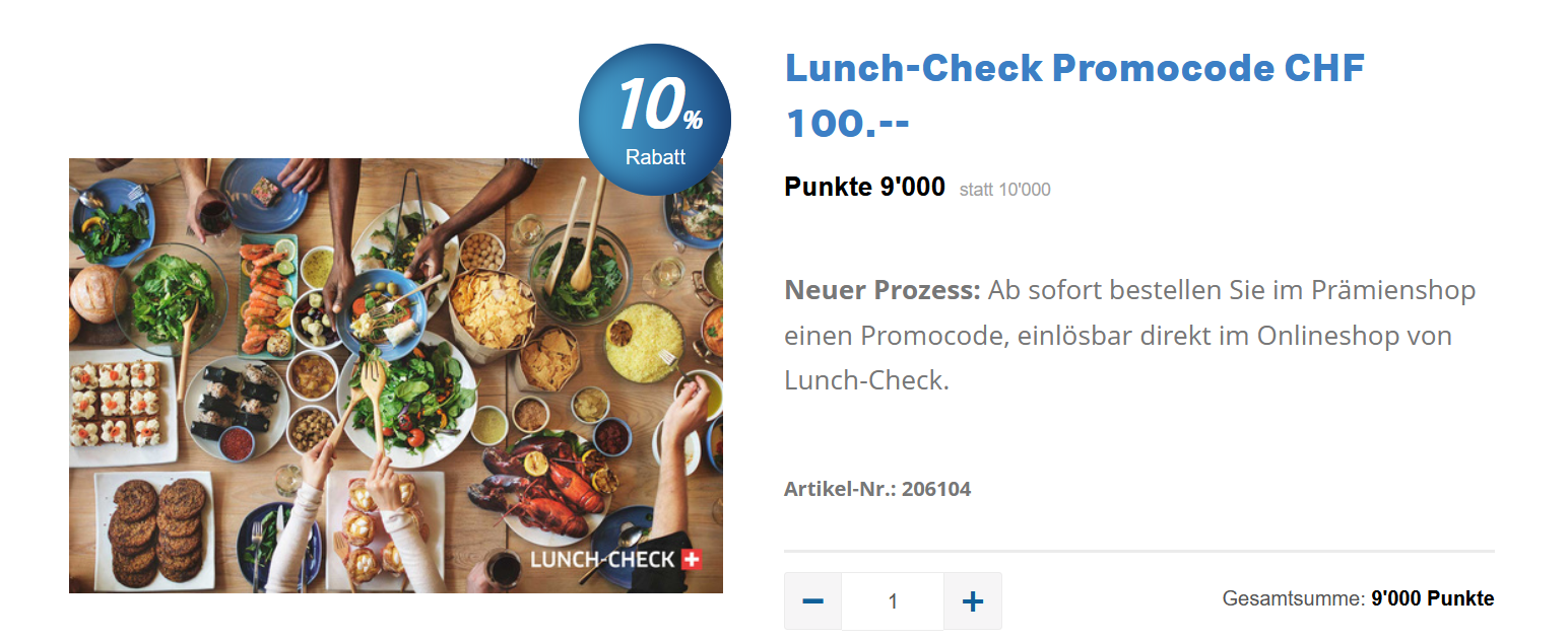 Bis Sonntag 3. Juli 2022 könnt ihr im Prämienshop Lunch Check Guthaben sichern mit 10% Rabatt.