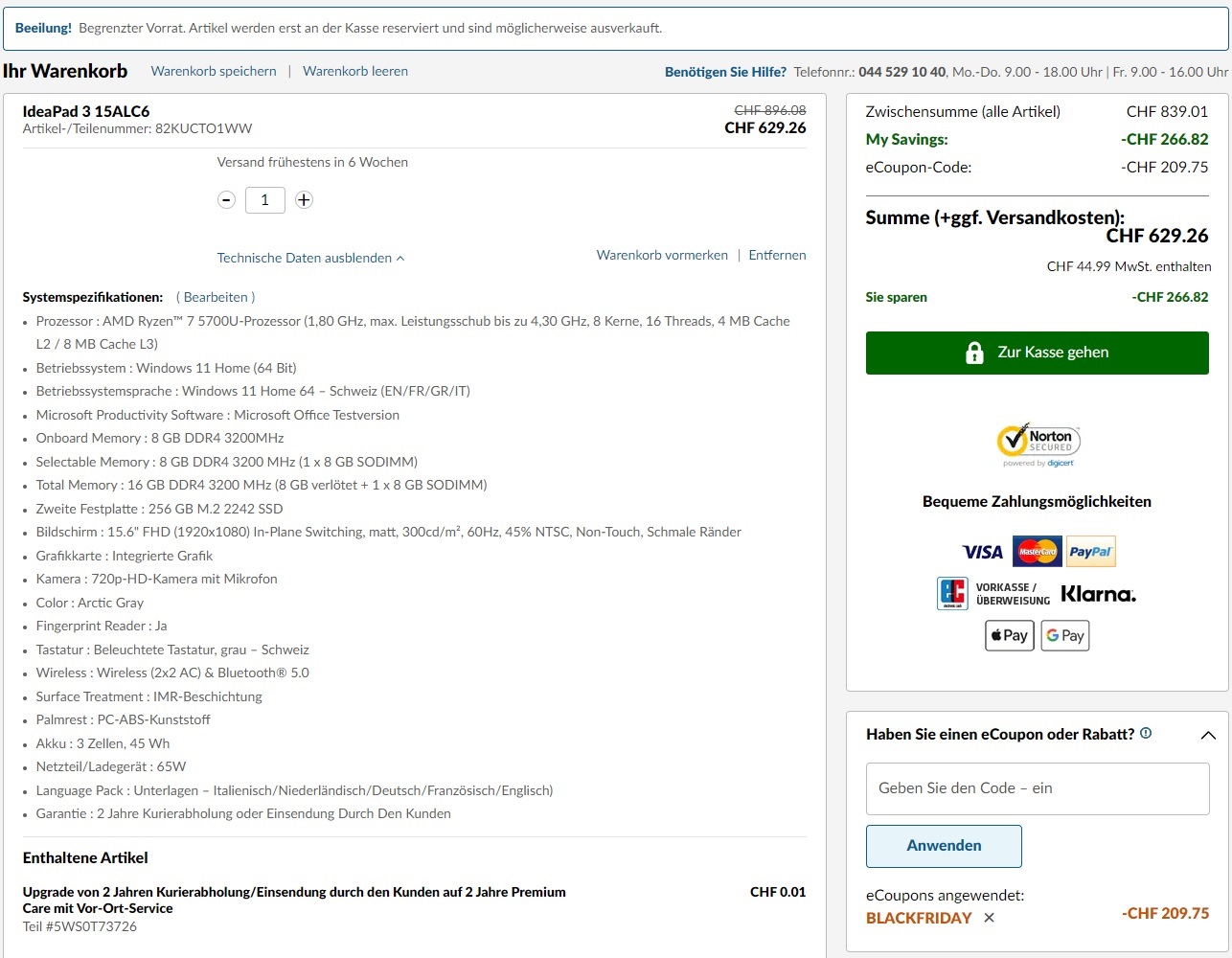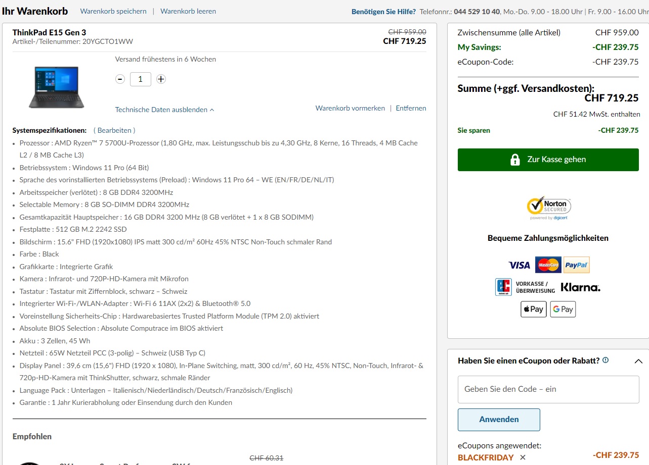 Lenovo hat in ihrem Shop immer wieder gute Aktionen. Deals mit bis zu 40% Rabatt und mit Code BLACKFRIDAY 25%. Hab mal ein Beispiel Notebook angepasst es ist das Ideapad 3 15ALC6 Finde es ist ein sehr gutes Angebot oder ein ThinkPad E15 Gen 3