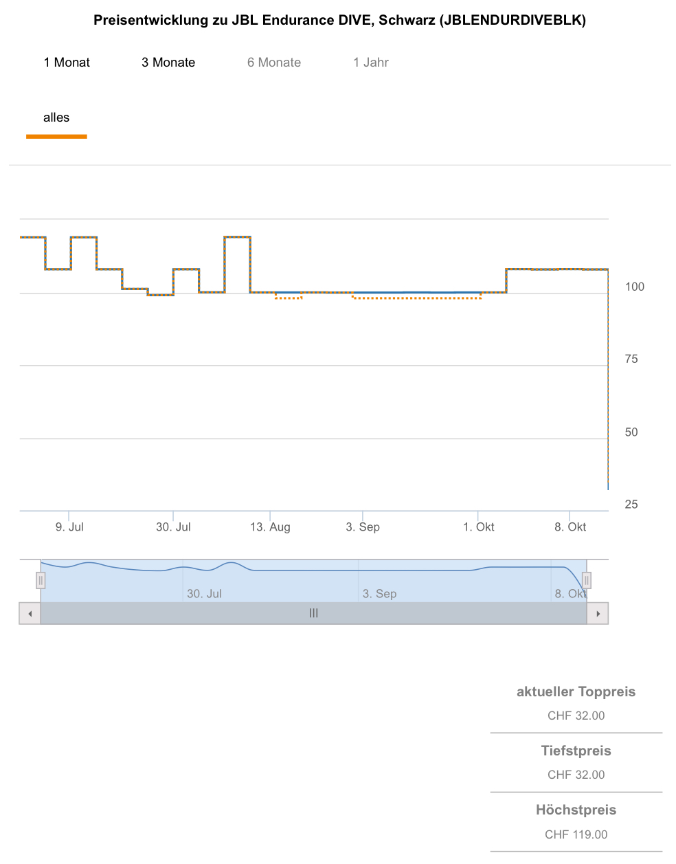 Da es den Kopfhörer über alle Farben bislang nie günstiger als für 83.90 CHF gab, könnte es sich hierbei auch um einen Preisfehler handeln. Der zweitbeste Preis liegt aktuell bei 97.90 CHF (gelb).