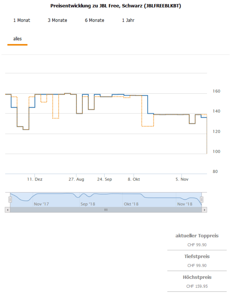 Gemäss toppreise war der best price über alle Farben bislang bei 123.90 CHF, der zweitbeste Preis aktuell liegt bei 138.85 CHF.