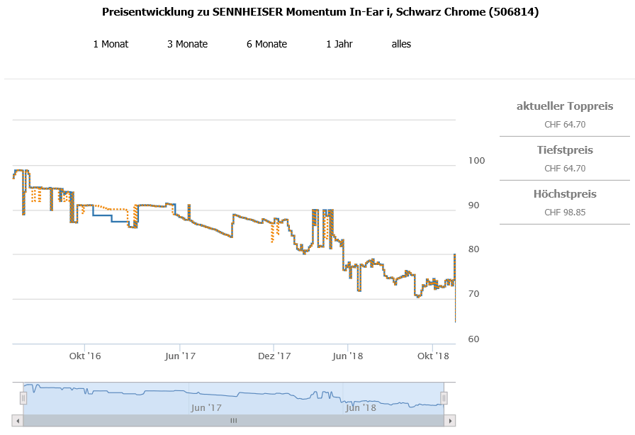 Gemäss toppreise gab es den Kopfhörer bislang nie günstiger als für 70.40 CHF, der zweitbeste Preis liegt aktuell bei 79.95 CHF.
