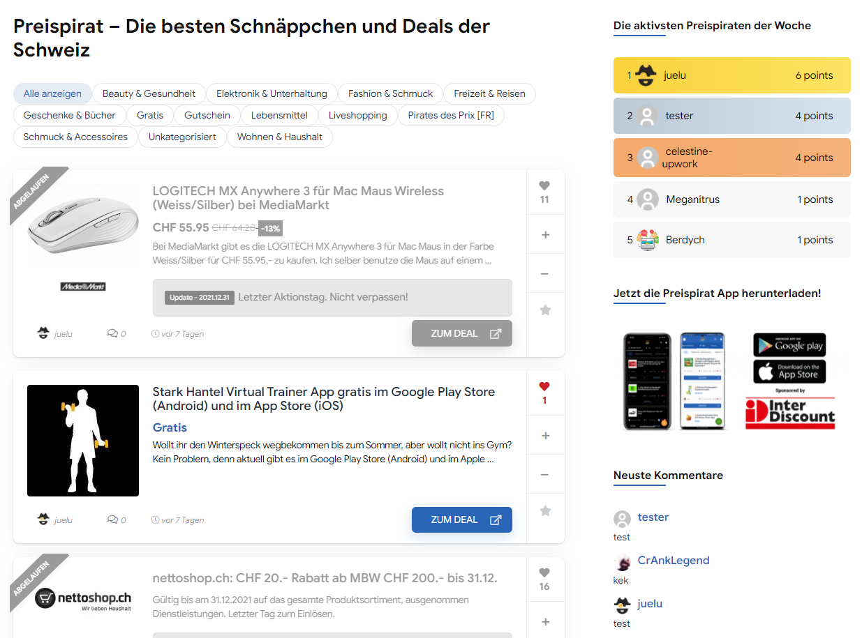Wie schon einige Male angeteasert, sind wir fast endlich fertig mit der Entwicklung des Redesigns der Preispirat-Homepage (ging ja nur knapp 8 Monate länger als erwartet 🤣). Die wichtigsten neuen Features, wie eine Favoriten-Funktion ❤️ bei Deals, eine neue Gutschein-Übersicht 🏷️ (in welcher nicht mehr alles wild durcheinander gemischt wird) sowie einem Slider zur Auswahl bestimmter Kategorien sind bereits implementiert! Es gibt noch one more thing 🧾, auf welches ihr aber noch ein Weilchein warten werden müsst bis zur Implementation 😉