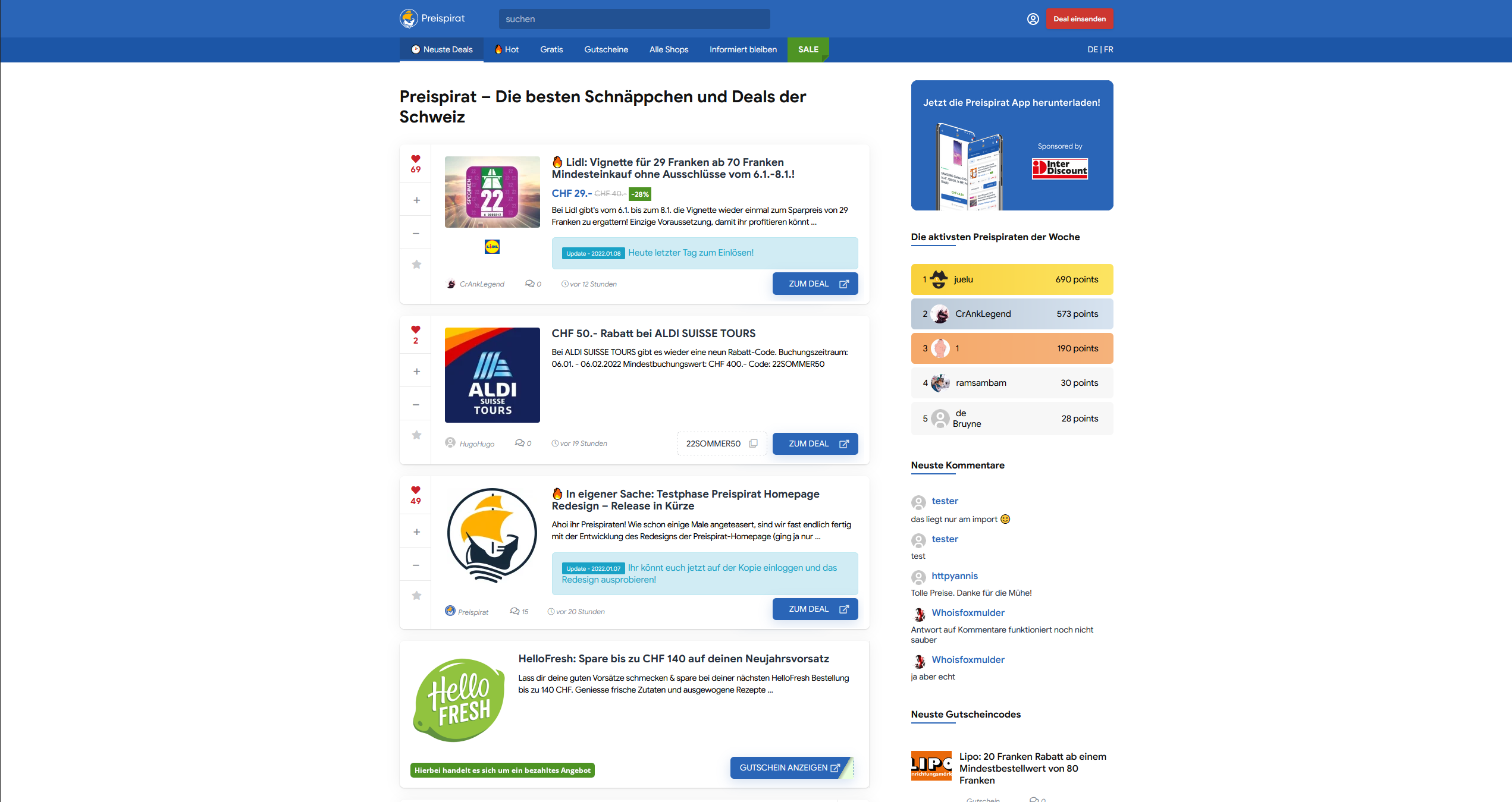 Wie schon einige Male angeteasert, sind wir fast endlich fertig mit der Entwicklung des Redesigns der Preispirat-Homepage (ging ja nur knapp 8 Monate länger als erwartet 🤣). Die wichtigsten neuen Features, wie eine Favoriten-Funktion ❤️ bei Deals, eine neue Gutschein-Übersicht 🏷️ (in welcher nicht mehr alles wild durcheinander gemischt wird) sowie einem Slider zur Auswahl bestimmter Kategorien sind bereits implementiert! Es gibt noch one more thing 🧾, auf welches ihr aber noch ein Weilchein warten werden müsst bis zur Implementation 😉