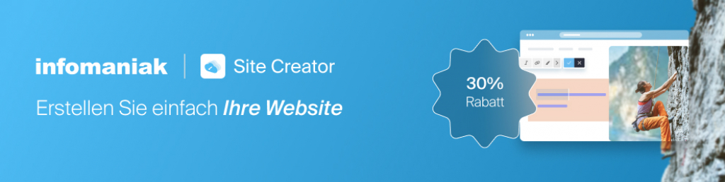 Profitiere von 30% Rabatt auf alle Hosting-Abos bei Infomaniak, mit dem Rabattcode SC-30-OFF-00564 und erstelle deine neue Webseite mit dem Site Creator ganz rasch und unkomplieziert, dank der Hilfe con KI und professionellen Designs.