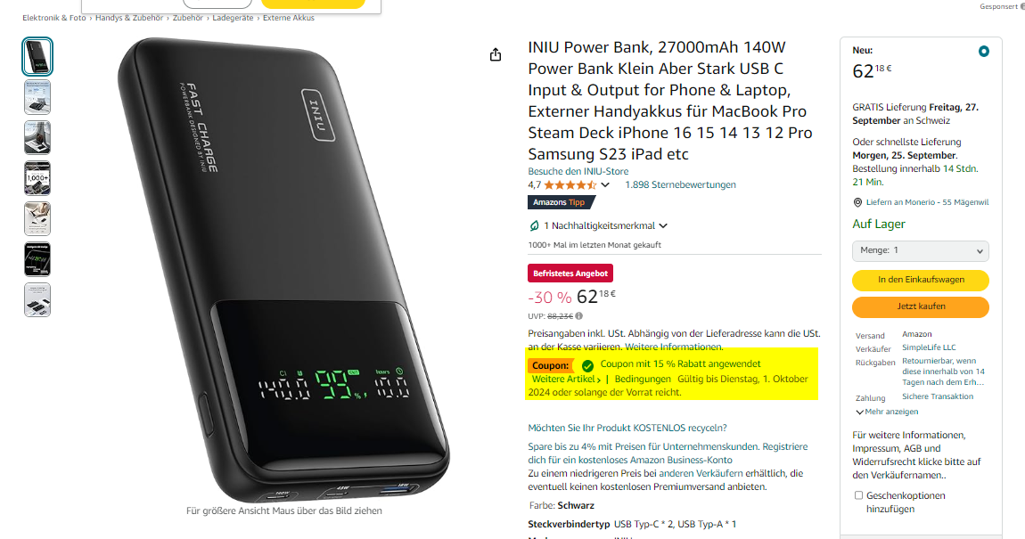 Bei Amazon gibt es aktuell die INIU Powerbank mit 27000 mAh und 140 W für den Preis von umgerechnet etwa 49.80 Franken. Damit ihr auf den Preis kommt, müsst ihr einfach den Coupon aktivieren. Der zweitgünstigste Anbieter verlangt hierfür 101.90 Franken mit Versand.