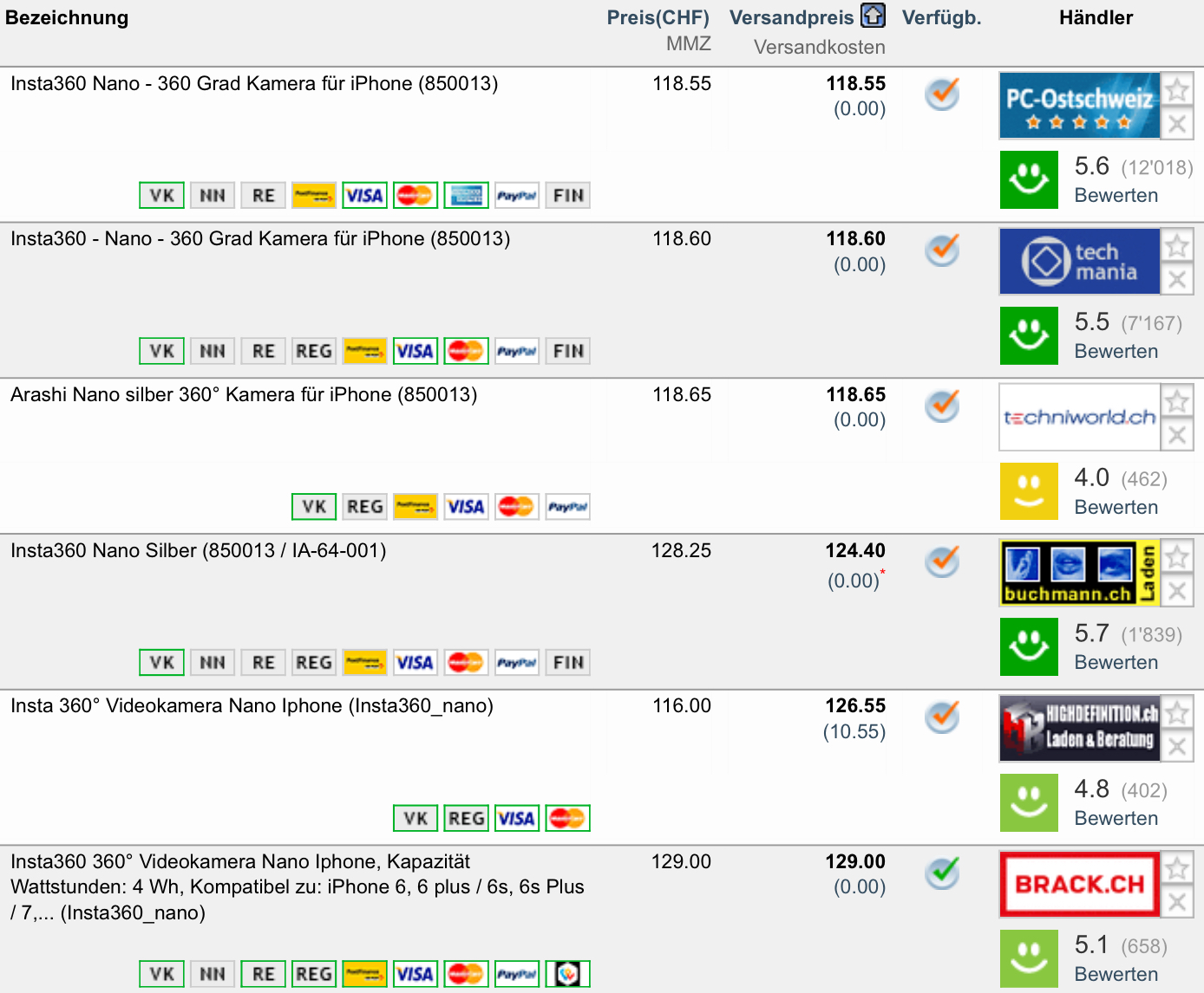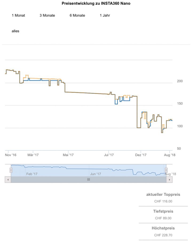 Gemäss toppreise gab es das Gadget bislang nie günstiger als für 89.- CHF. Der zweitbeste Preis liegt aktuell bei 118.55 CHF.