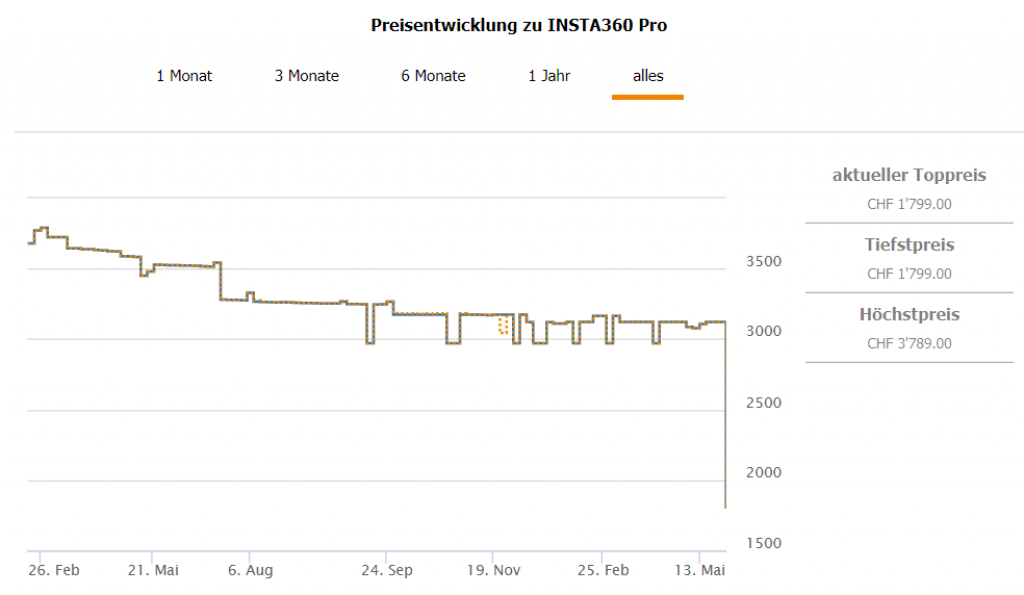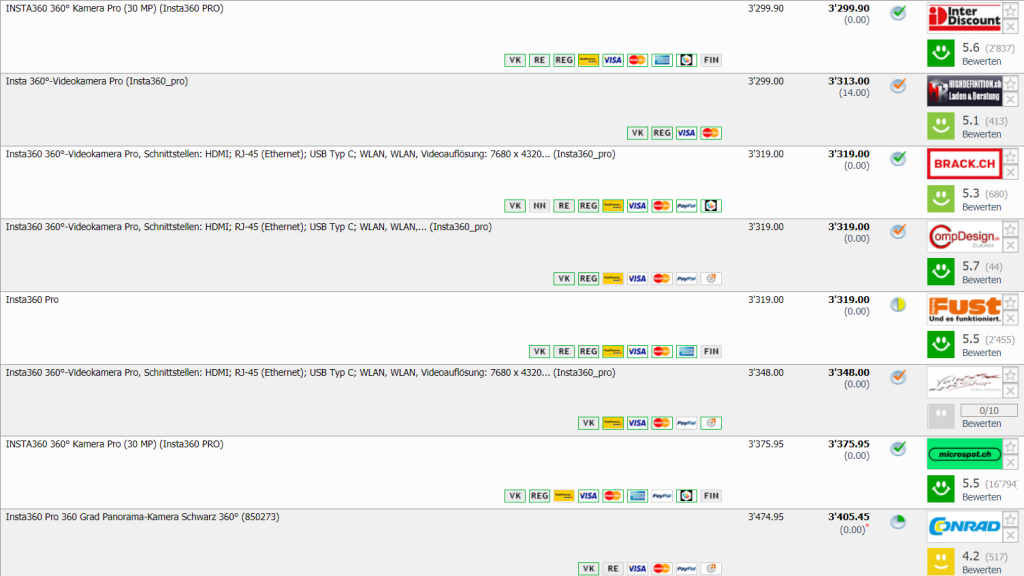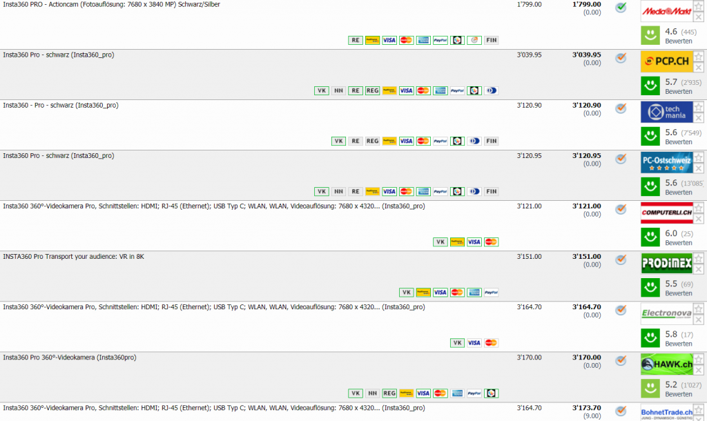 Bei MediaMarkt gibt’s gerade die INSTA360 PRO - Actioncam (Fotoauflösung: 7680 x 3840 MP) Schwarz/Silber reduziert für CHF 1799.- Zweitbester Preis liegt bei CHF 3039.95