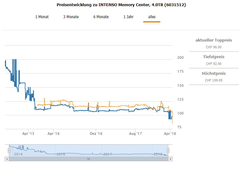 Die Disk kostet normalerweise 107 CHF. Bei Steg dem zweitgünstigsten Preis kostet sie 107.90 mit dem Code 20INTENSO erhältst du aber 20% Rabatt und bezahlt so nur 85.60 CHF für eine 4TB 2,5 Zoll externe HD mit USB 3.0 Anschluss. Ein wirkliches Schnäppchen! Das hätte ich mir vor Netflix Zeiten gewünscht. Alle Filme Raufballern und mit Freunden tauschen einfach richtig cool!
