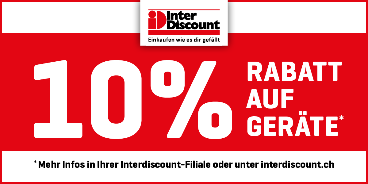 Der Rabatt ist gültig auf Fernseher, iMac, MacBook, iPad, Tablets, PCs, Notebooks, Convertibles, Monitore, NAS, Drucker, Home Cinema, Beamer, Soundbars, SAT-Anlagen, DVD-/Blu-ray-Geräte, HiFi/Radio, Bluetooth-Speaker, MP3, Fotokameras, Camcorder, Navigationsgeräte, Smartwatches, Mobiltelefone ohne Abos (exkl. iPhone), Telefone, Bürogeräte, Küchengeräte, Kaffeemaschinen, elektrische Zahnbürsten, Rasierer, Epilierer, Haartrockner/-glätter, Bügeleisen, Staubsauger, Elektrogrossgeräte, Grill, Drohnen und Spielkonsolen (exkl. Playstation 5) in deiner Interdiscount-Filiale und im Online-Shop gekennzeichnete Artikel. Rabatt nicht kumulierbar mit anderen Bons oder Rabattaktivitäten. Reparaturen, Dienstleistungen, Spezialbestellungen, Mobile-Abonnemente, Wert-
