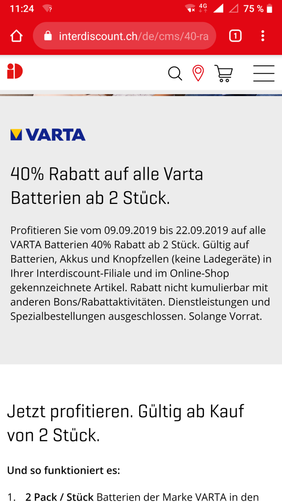 Profitieren Sie vom 09.09.2019 bis 22.09.2019 auf alle VARTA Batterien 40% Rabatt ab 2 Stück. Gültig auf Batterien, Akkus und Knopfzellen (keine Ladegeräte) in Ihrer Interdiscount-Filiale und im Online-Shop gekennzeichnete Artikel. Rabatt nicht kumulierbar mit anderen Bons/Rabattaktivitäten. Dienstleistungen und Spezialbestellungen ausgeschlossen. Solange Vorrat.