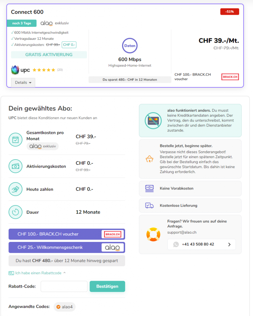 Bei Alao gibts wieder einmal das UPC Connect 600 Internet-Abo fürs Zuhause zum Aktionspreis von 39 Franken pro Monat. Speziell am Angebot ist dabei der CHF 100.- Brack Gutschein, den man erhält. Mit dem Code alao4 liegen zudem weitere 25 Franken drinnen. Darüber hinaus sind die Aktivierungsgebühren kostenlos. Das Angebot gilt noch bis zum 31.07.