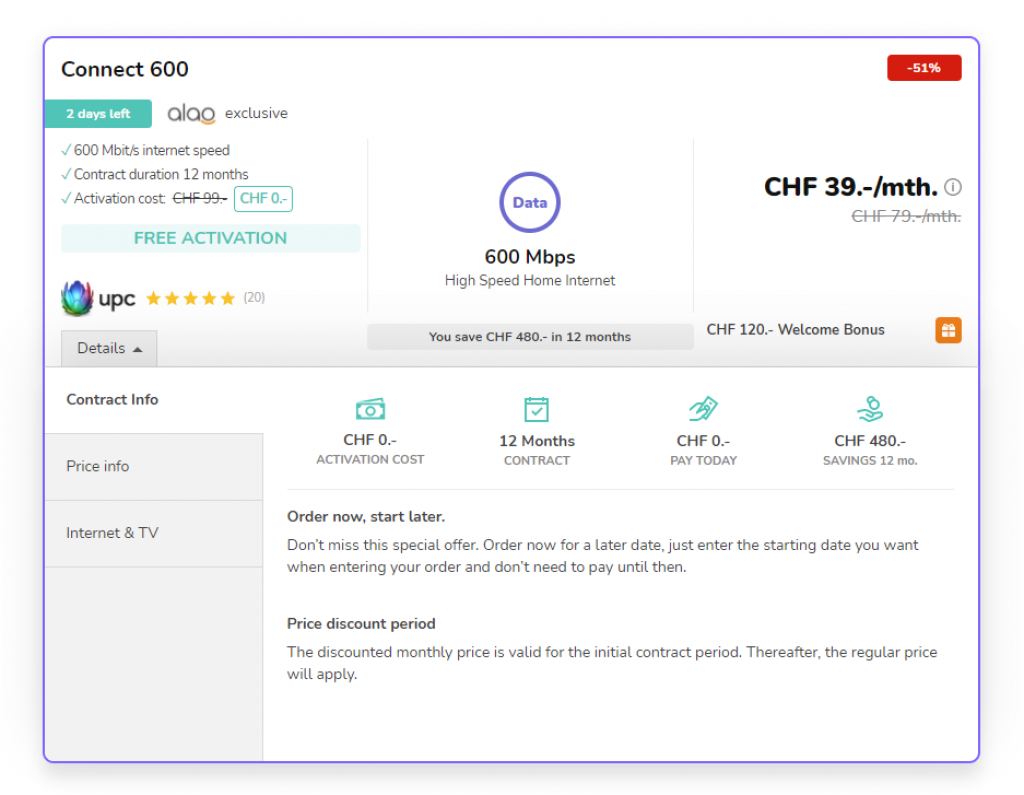 Bei Alao gibts wieder einmal das UPC Connect 600 Internet-Abo fürs Zuhause zum Aktionspreis von 39 Franken pro Monat. Speziell am Angebot ist dabei der Cashback, den man erhält. Alao bietet schon von sich aus einen Cashback von 120 Franken an, mit dem Code alao4 liegen zudem weitere 25 Franken drinnen. Darüber hinaus sind die Aktivierungsgebühren kostenlos.