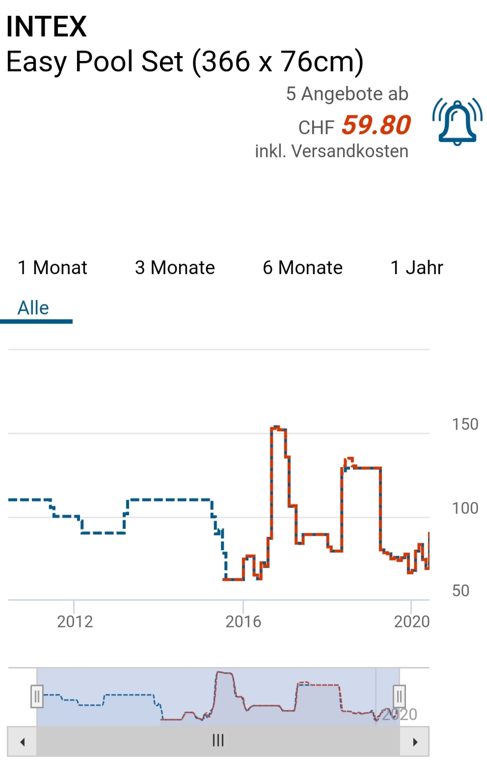 Bei Galaxus gibts gerade das Gewebebecken ohne Stangen in der 366x76cm Ausführung für knapp 60 Franken. Laut toppreise/Google Shopping liegt der zweitgünstigste Preis für dieses Produkt bei 99 Franken.