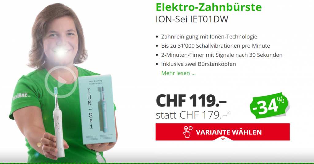 Bei Daydeal gibt es bis morgen die ION-Sei IET01DW elektronische Zahnbürste zum neuen Bestpreis von CHF 119.-. Der Vorherige Bestpreis lag bei CHF 149.-. Der zweitbeste Preis liegt bei CHF 164.25.