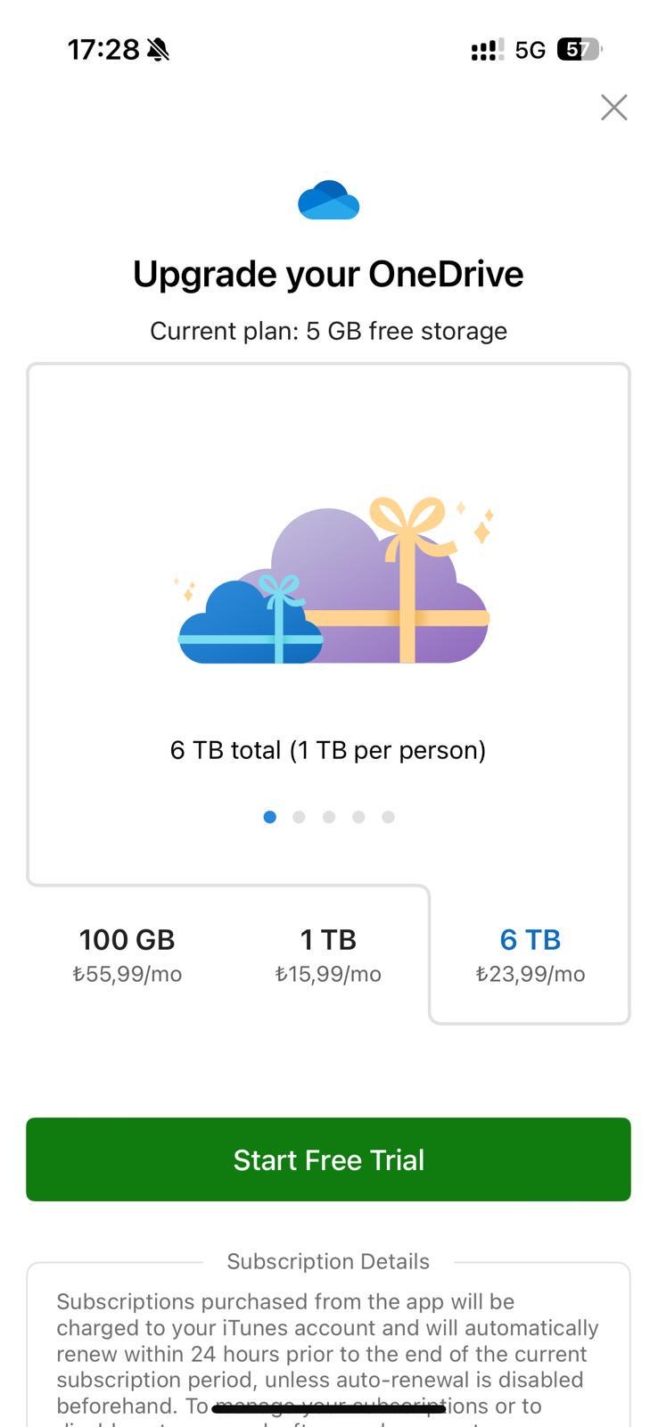 Bei der OneDrive iOS-App gibt es derzeit einen „Fehler“ in der, dass man günstig Microsoft Office 365 6TB über Türkei erhalten kann. Und zwar habt ihr die Möglichkeit, Microsoft Office 365 Premium Single inkl. 100 GB Speicher für knapp 3 CHF zu bekommen, oder - noch besser - Microsoft Office 365 Family für 6 Personen inkl. 1TB pro Nutzer für sage und schreibe 24 YTL, was umgerechnet circa 67 Rappen sjnd (Tendenz sinkend 😂).