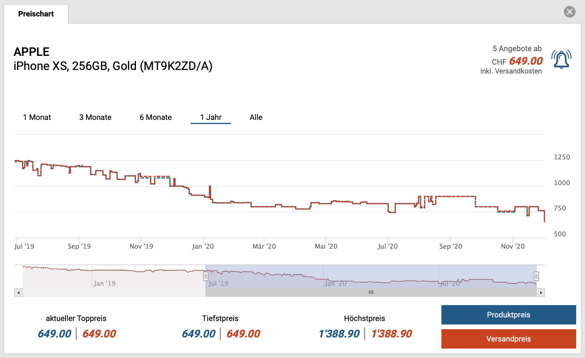 Das etwas ältere iPhone gibt es zwar nicht mehr an allzu vielen Orten verfügbar, aber MediaMarkt bietet es aktuell zum neuen Bestpreis an. Für 649.- Fr. ist es über 100.- Fr. günstiger als beim zweitgünstigsten Anbieter Revendo und zudem rund 60.- Fr. unter dem alten Bestpreis.