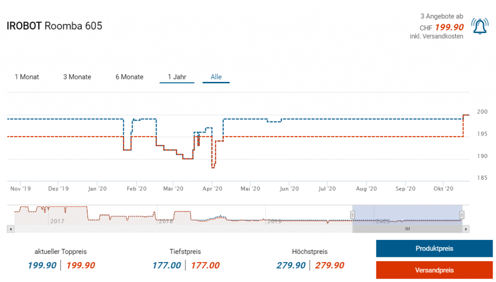 Bei Amazon gibts derzeit den Staubsaugerroboter der Einstiegsklasse, dem Roomba 605 zum Preis von 170 Franken. Laut toppreise starten die Preise für dieses und ähnliche Modelle bei ca. 200 Franken.