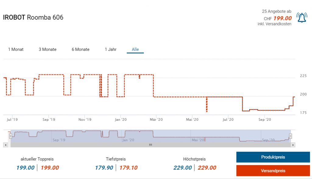 Bei nettoshop gibts derzeit den Staubsaugerroboter Roomba 606 (schwarze Variante im Vergleich zum 605 von gestern, sonst funktionsgleich) mit dem 20 Franken Bon zum Preis von CHF 179.90. Laut toppreise liegt der Vergleichspreis bei CHF 199.90 vom roomba Shop (der zudem noch 5 Jahre Garantie anbietet vs. 2 Jahre von nettoshop). Es gestaltet sich also nach eurer persönlichen Präferenz, wo ihr einkauft.