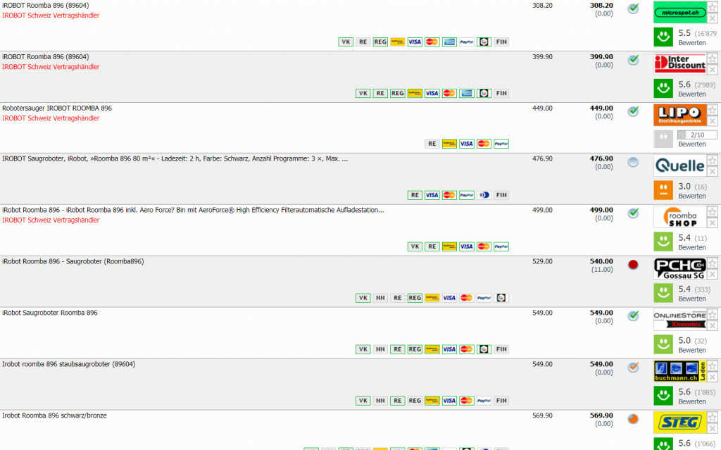 Bei microspot erhält man den IROBOT Roomba 896 gerade für CHF 308.20 Zweitbester Preis liegt bei CHF 399.90 Bestpreis war laut toppreise bei CHF 359.90