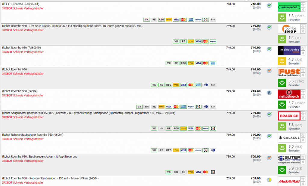 Den Roomba 965 gab es Anfang Jahr für 549 CHF bei Microspot. Der Unterschied zum 960 ist die Farbe.