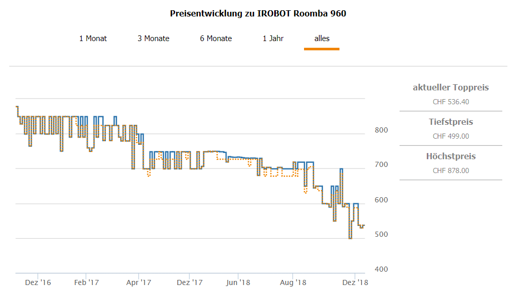 Die CHF 489.- sind laut toppreise ein Bestpreis, günstiger als für CHF 499.- gab’s den Roboterstaubsauger noch nicht. Aktuell liegt der zweitbeste Preis bei CHF 536.40 Bei vielen Shops ist der Robo-Staubsauger aber deutlich teurer.