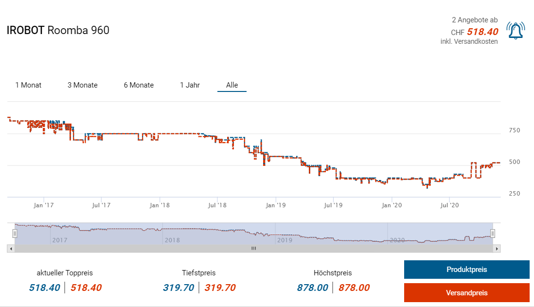Bei amazon.de gibts derzeit den Staubsaugerroboter Roomba 960 zum Aktionspreis von knapp 301 Franken. Laut toppreise läge der Vergleichspreis für dieses Modell bei weit über 500 Franken, daher nehme ich mal keinen Vergleichspreis (zumal das besser ausgestattete Modell 980 für 399 kaufbar wäre).