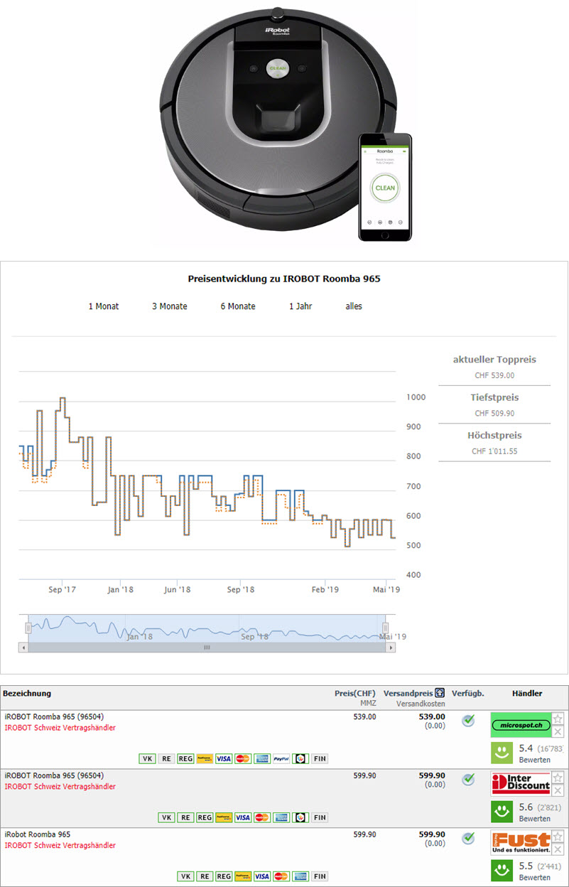 Wem die Deckelfarbe egal ist, kann auch den iRobot Roomba 960 kaufen. Den gibt es momentan bei Galaxus in Aktion für CHF 449.