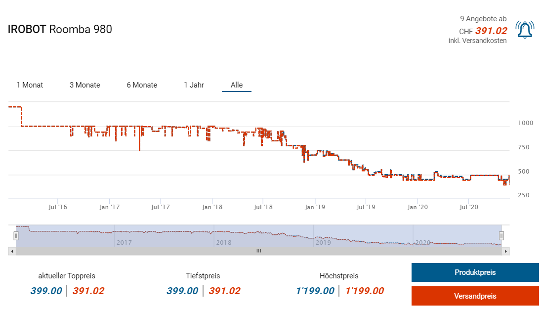 Bei myrobotcenter gibts derzeit den Staubsaugerroboter Roomba 980 zum Aktionspreis von 399 Franken (resp. CHF 391.02 bei Zahlung per Vorauskasse) sowie 5 Jahre Garantie dazu. Wem die Farbe nicht passt kann das (wohl baugleiche) Modell 981 von Amazon für knapp 401 Franken bestellen, dort wären aber nur 2 Jahre Garantie dabei. Beim Angebot vom myrobotcenter sind indes noch weniger als 20 Stück vorhanden, man sollte also bald zuschlagen.