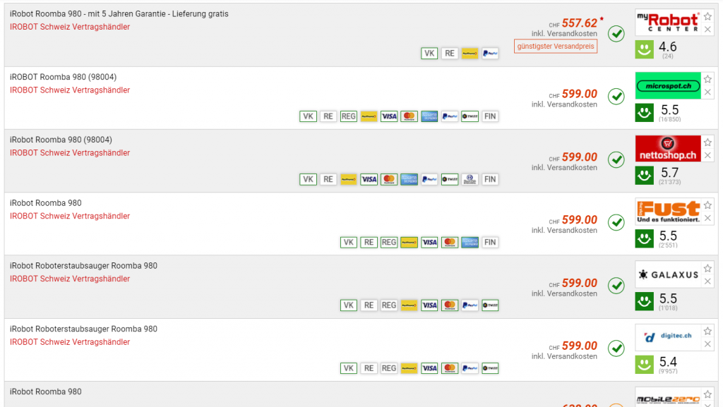 Bei DeinDeal gibt’s gerade den iRobot Roomba® 980 zum neuen Bestpreis von CHF 499.- Dazu kommen noch CHF 9.90 für die Lieferung. Bestpreis war bei CHF 538.- Zweitbester Preis im Moment beträgt CHF 557.60