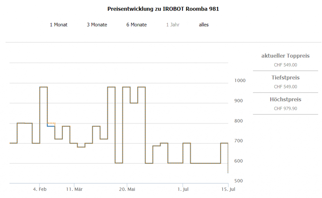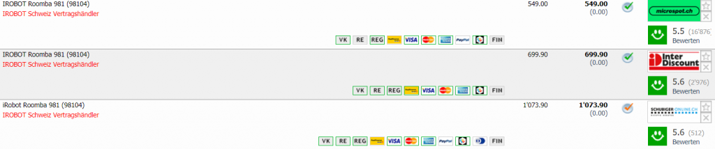 Bei microspot erhält man gerade den Roomba 981 für CHF 549.- Bisheriger Bestpreis war bei CHF 599.90, zweitbester Preis beträgt zur Zeit CHF 699.90
