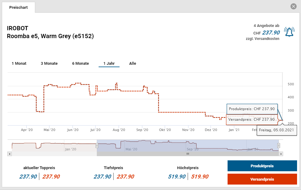 Aktuell gibt es den Roomba e5152 zu einem guten Tarif, auf den bereits reduzierten Staubsaugerrobotter lassen sich nochmals CHF 15.- Rabatt mit dem Gutschein „15TRAD150aus diesem Beitrag abziehen. Somit kommt man auf den neuen Bestpreis von CHF 222.90. Mit einer Bewertung von 4.8 von 5 scheint er auch eine gutes Preis-Leistungsverhältnis zu bieten.