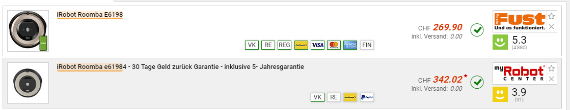 Bei Fust gibt es zu Ostern den iRobot Roomba E6198 Staubsaugroboter für CHF 269.90. Ein Preisverlauf ist leider nicht vorhanden, der zweitbeste Preis beträgt jedoch CHF 342.02.