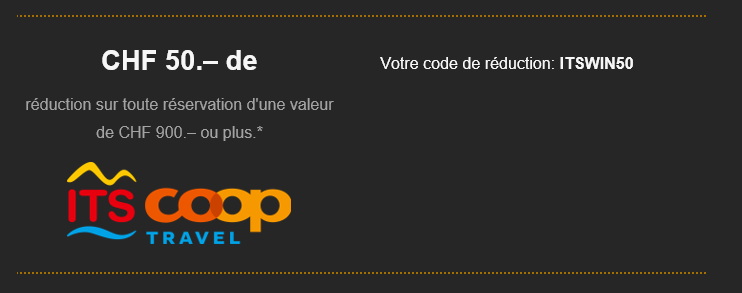 *Angebot gültig bis 31.05.2021. Gültig auf www.itscoop.ch mit dem Aktionscode ITSWIN50 auf alle klassischen Angebote (Strandaufenthalte und „Nur Unterkunft“-Pakete) und auf neue Buchungen zwischen dem 03. und 31.05.2021. Nicht gültig für dynamische Angebote.