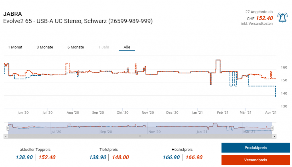 Bei arp.ch gibts derzeit ein weiteres Schnäppchen in Kombination mit dem Newsletter-Gutschein. So gibts das On-Ear-Headset fürs Office, die Jabra Evolve 2 65 zum Preis von CHF 136.65 anstatt CHF 147 bei Amazon. In der Schweiz würde der Vergleichspreis gar bei über 152 Franken liegen. Zudem handelt es sich laut toppreise um einen neuen Bestpreis.