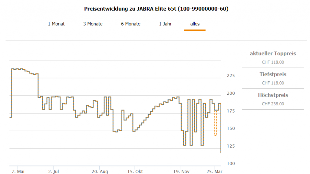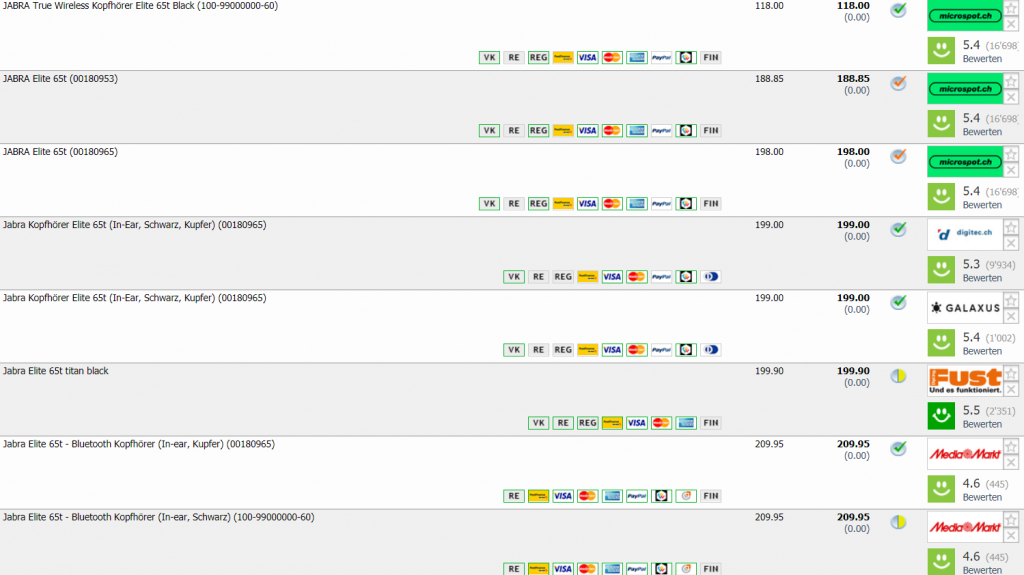Bei microspot gibt’s die Jabra True Wireless Elite 65t InEars für CHF 118.- Zweitbester Preis beträgt CHF 199.- Bestpreis war bei CHF 129.-