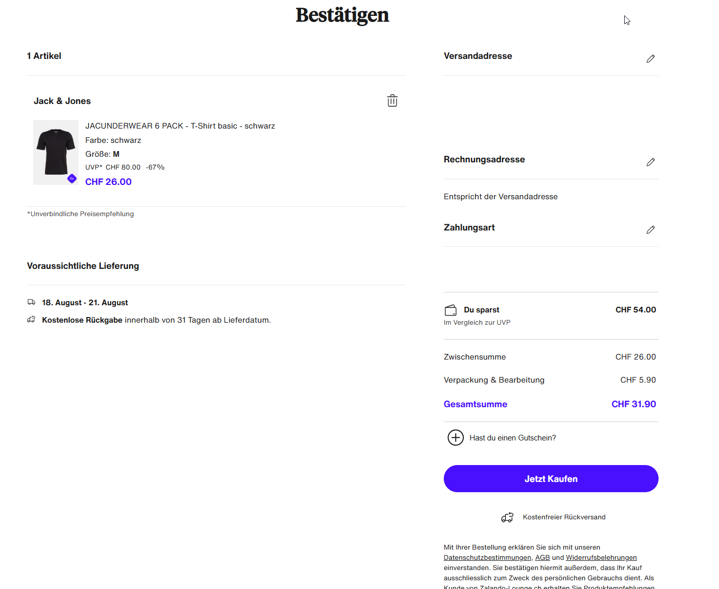 Das Jack & Jones Basic 6er-Pack T-Shirt gibt es in verschiedenen Farben und Grössen von S bis XXL bei Lounge by Zalando für den Preis von 31.90 Franken mit Lieferung dazu berechnet. Andere Anbieter verlangen einen Preis von 40.62 Franken.