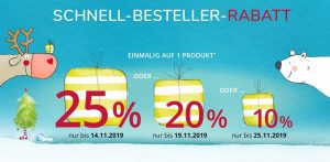 Bestellt man bis zum 14.11. erhält man 25%, bis zum 19.11. 20% und bis zum 25.11. noch 10%.