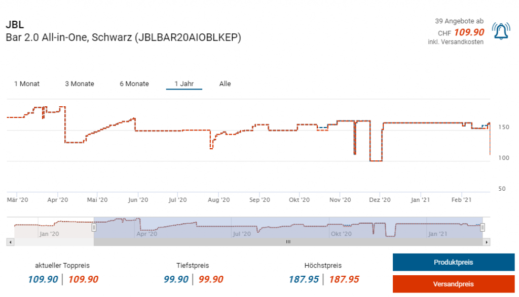 Bei Fust gibts derzeit die 2.0 Soundbar von JBL zum Aktionspreis von knapp 110 Franken. Mit dem bekannten 10 Franken Bon erreicht ihr den Dealpreis von CHF 99.90. Der Bestpreis lag am Black Friday auch bei Fust bei knapp 90 Franken.