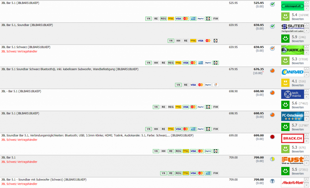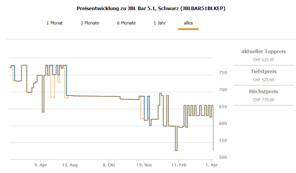 Bei microspot gibt’s die JBL Bar 5.1 Soundbar mit 3x Lautsprecher und 1x Subwoofer für CHF 525.25. Diesen Preis gab es schon einmal, der zweitbeste Preis beträgt satte CHF 659.95