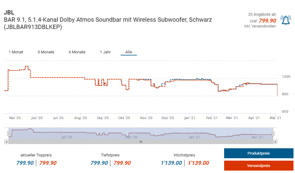 Bei Interdiscount gibts derzeit die Dolby Atmos Soundbar JBL Bar 9.1 mit einem 5.1.4-Setup und 820W Leistung zum Aktionspreis von CHF 799.90. Laut toppreise liegt der Preis sonst bei knapp 933 Franken.