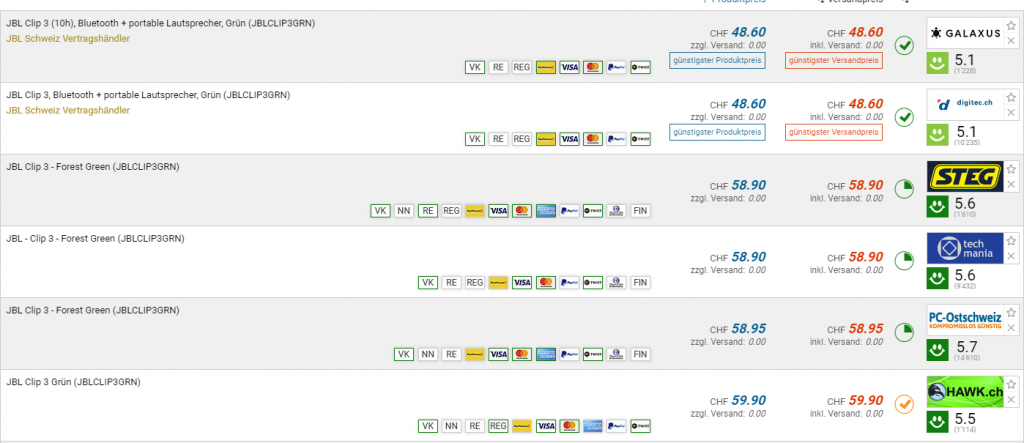 Bei galaxus und dem Partner digitec gibt es den JBL Clip 3 Lautsprecher für CHF 48.60. 2018 konnte man ihn für CHF 39.- erhalten, seitdem war der Preis nicht mehr so tief. Der zweitbeste Preis beträgt CHF 58.90.