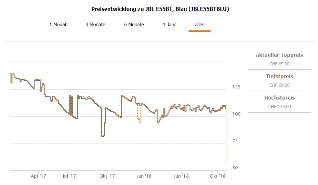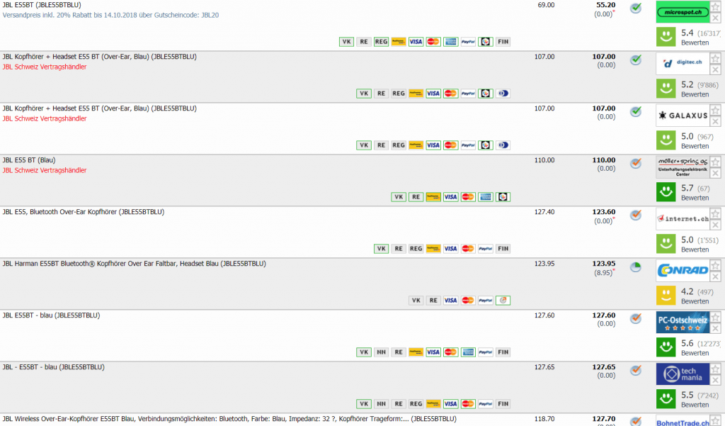 Bei microspot gibt’s gerade den JBL E55BT in verschiedenen Farben für CHF 55.20, wenn man den Gutscheincode JBL20 einsetzt. Der zweitbeste Preis in der Schweiz beträgt CHF 107.- für die blaue Version, alle anderen Farben sind sogar noch leicht teurer. Die blaue Version gab’s schon mal für CHF 81, alle anderen Versionen gab es noch nie unter 90 Franken. Also wirklich ein tolles Angebot von microspot.