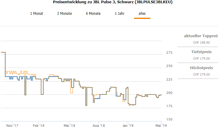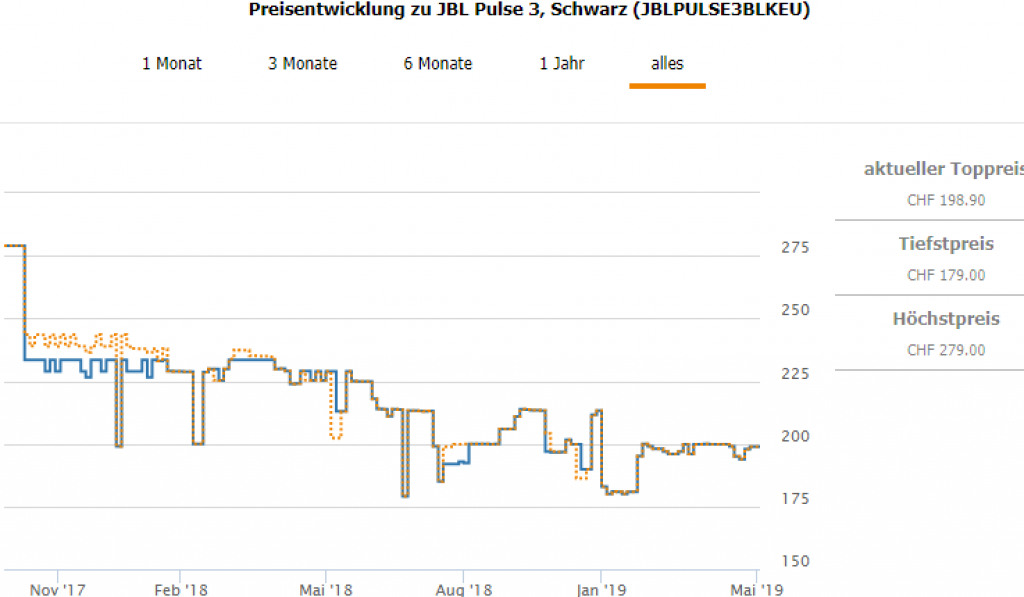 Mit CHF 149.- bietet digitec laut toppreise.ch den bisher besten Preis für den Lautsprecher, denn noch nie gab es das Gerät für weniger als CHF 179.-. Der zweitbeste Preis liegt aktuell bei CHF 198.90, sodass man hier deutlich spart.