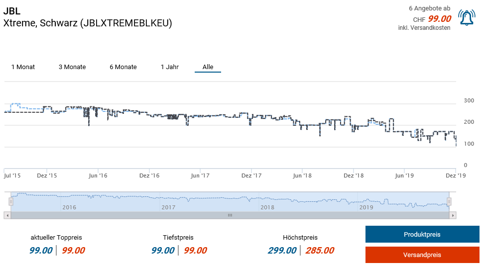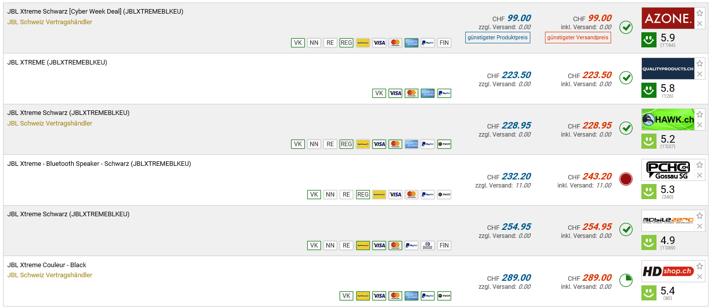 Bei azone gibt es aktuell den JBL Xtreme in Schwarz für 99.- CHF. Zweitbester Preis gemäss toppreise sind 223.50 CHF, wurde ich aber bei nem Auslaufmodell nicht als Referenz sehen, bestprice waren 119.- CHF.
