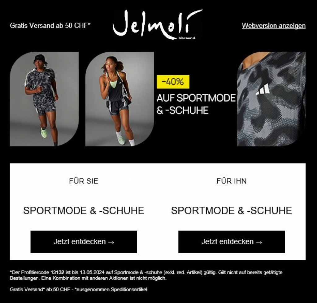 Jelmoli Shop Gutschein für 40% Rabatt auf Sportmode & - uns Schuhe bis heute um Mitternacht!