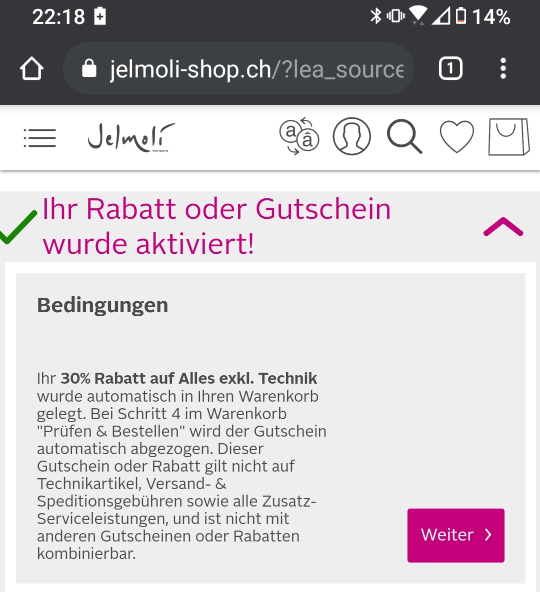 Hast du evtl. über die Jelmoli-App bestellt? Oder Adblocker aktiviert gehabt? Und wenn auf dem PC bestellt: Hast du ein eigenes Browser-Profil ohne Plugins verwendet?