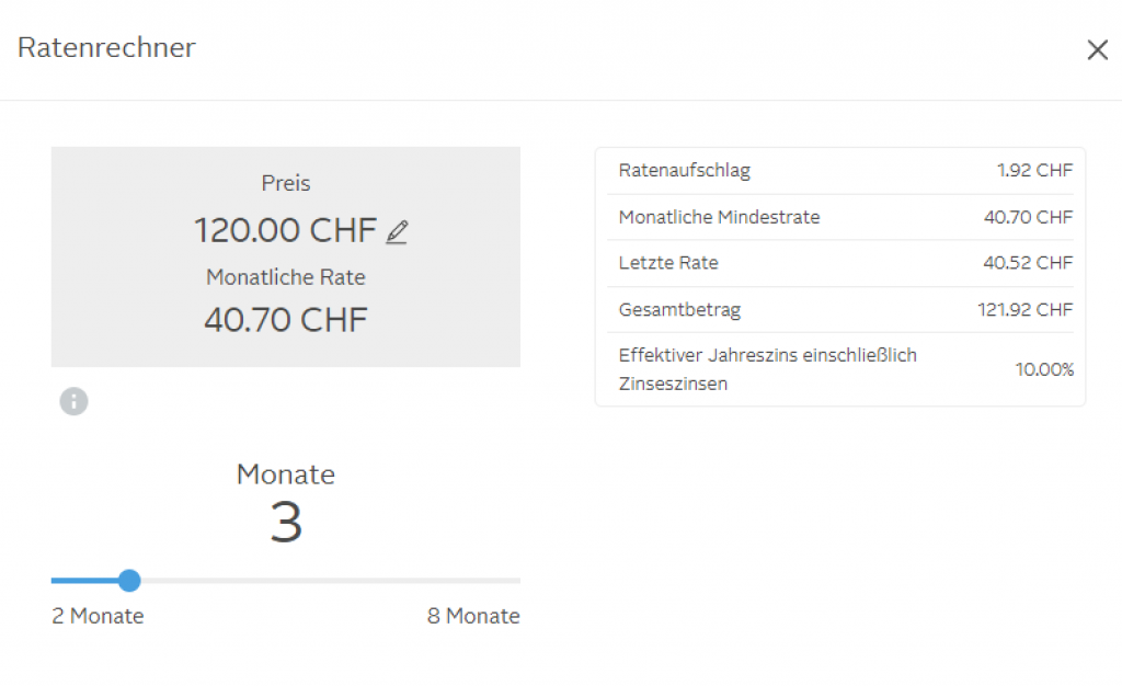 Der Ratenrechner deckt ev. nicht alles ab - vermutlich kommen noch 3.- Rechnungsführungsgebühr pro Monat hinzu - siehe https://www.srf.ch/audio/espresso/ackermann-versand-kassiert-fragwuerdige-kontofuehrungsgebuehr?id=12183204
